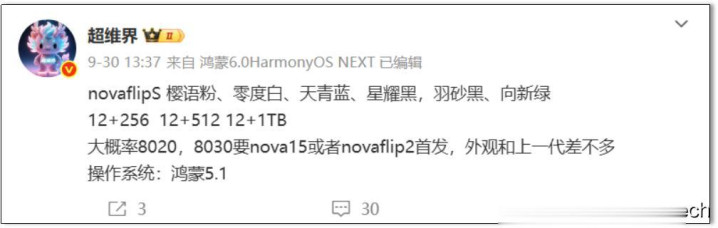 “nova flip S 樱语粉、零度白、天青蓝、星耀黑,羽砂黑、向新绿,12+256 12+512 12+1TB。大概率8020,8030要nova15或者novaflip2首发,外观和上一代差不多 。操作系统:鸿蒙5.1”